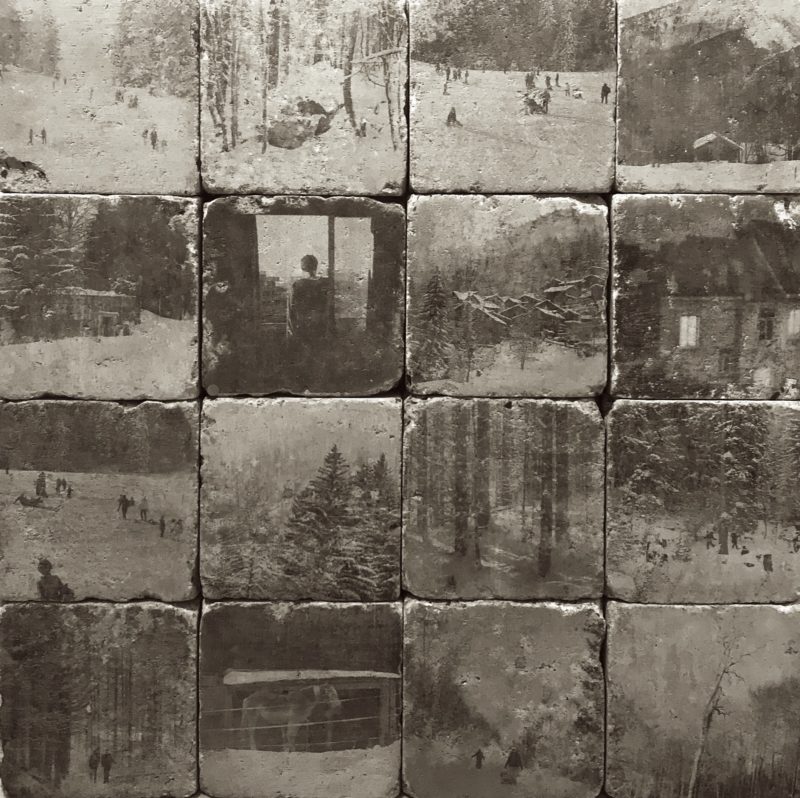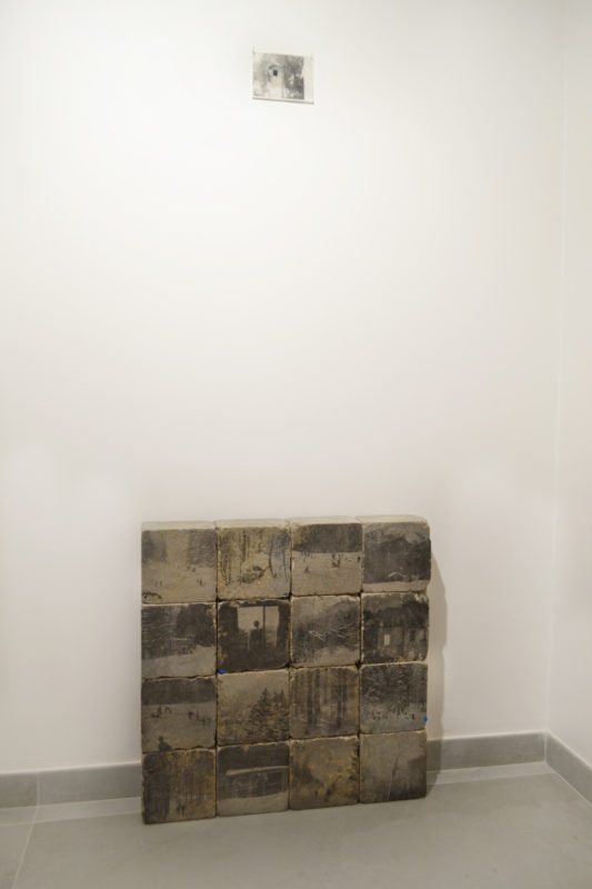Ces pièces ont été réalisées au cours d’un processus lent, long et physiquement exigeant. J’ai imprimé 361 pavés (une palette), un à un, dans un laboratoire argentique, grâce à un procédé de photosensibilisation par émulsion liquide. La densité, le poids (1,5 tonne de ciment) et le caractère calibré du matériau manufacturé par la main de l’homme, entrent pour moi en résonnance avec l’idée de bâtir sa propre mémoire. L’imaginaire d’une auto-construction de nos identités ou d’un narratif auto-mythologique, m’est particulièrement cher et participe de cette rencontre entre la mémoire comme propos et le matériau de construction comme forme. Dans le même ordre d’idée, je souhaite avant tout montrer les pavés dans des installations qui permettent de constamment réagencer ces fragments de mémoire tout en évoquant le travail du bâtisseur : construire des murs et des sols de pavés photographiques, ou encore – j’espère en avoir un jour l’occasion – réaliser un monticule de pavés à la manière des montagnes de sable ou de gravier qui attendent sur le bord d’un chantier. Je vois dans le motif du monticule, l’idée d’un matériau de la mémoire disponible, en attente d’être mobilisé, transformé, assemblé ; une toute petite montagne éphémère dans l’entre de ses métamorphoses.